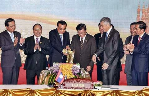 Cắt bánh mừng hội nghị cấp cao kỷ niệm 25 năm thiết lập quan hệ đối thoại ASEAN-Trung Quốc ngày 7-9 tại Vientiane (Lào). Ảnh: EPA