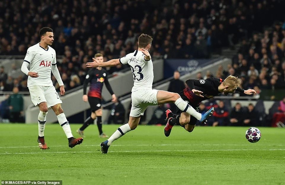 Ben Davies phạm lỗi với Konrad Laimer khiến Tottenham phải chịu phạt đền.