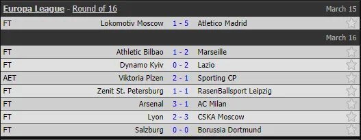 Như vậy, tám đội Arsenal, Atletico Madrid, Lazio, Marseille, CSKA Moscow, RB Salzburg, Sporting CP và RasenBallsport Leipzig lọt vào tứ kết Europa League. Buổi lễ bốc thăm vòng tứ kết Europa League và cả Champions League sẽ diễn ra vào chiều tối nay (16-3).