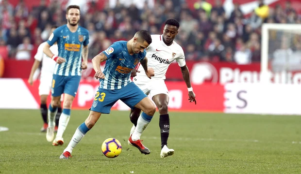 Các cầu thủ Atletico Madrid (áo xanh) gặp khó khăn khi đến chơi trên sân của Sevilla.