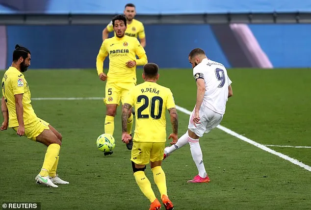 Benzema dứt điểm đưa bóng găm vào góc cao khung thành, giúp Real gỡ hoà 1-1. Ảnh: Reuters.