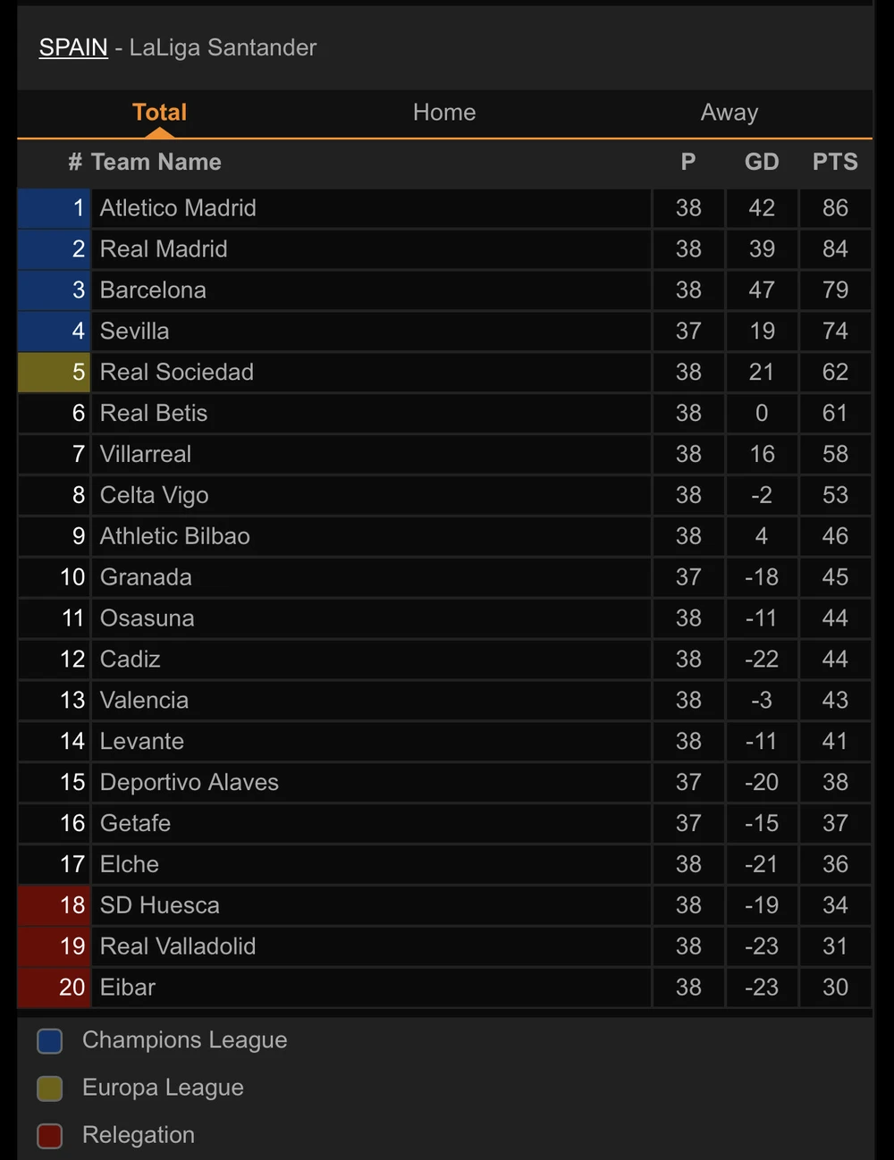 La Liga kết thúc với 4 chiếc vé tham dự Champions League thuộc về Atletico Madrid, Real Madrid, Barcelona và Sevilla. Real Sociedad giành vé dự Europa League còn Huesca, Real Valladolid và Eibar là 3 CLB phải xuống hạng.