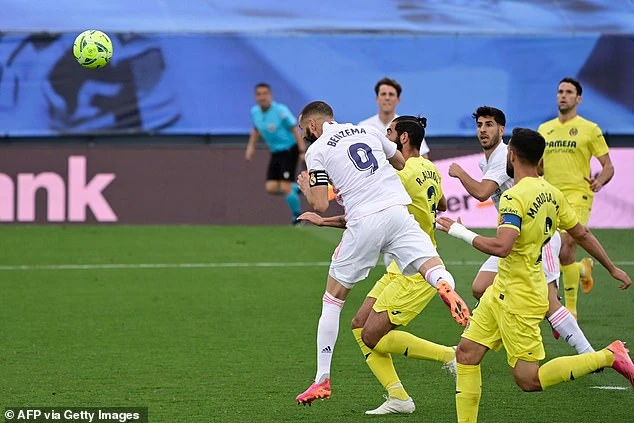 Pha đánh đầu làm bàn ở phút 55 của Benzema không được trọng tài công nhận do lỗi việt vị. Ảnh: Getty Images.