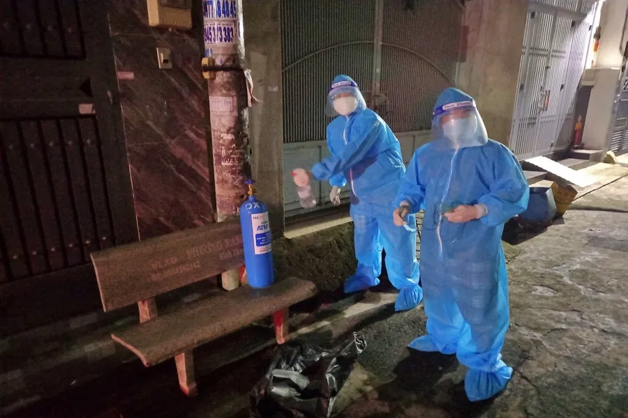 Tình nguyện viên của ATM oxy vận chuyển bình oxy đến nhà bệnh nhân vào đêm tối. Ảnh: NL