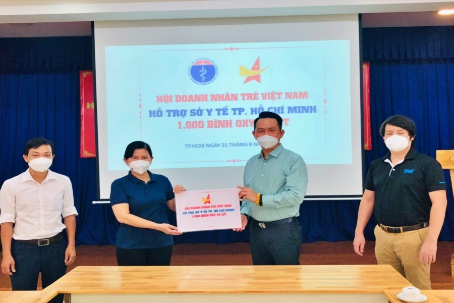 Ngày 21-8, ông Đặng Hồng Anh, Chủ tịch Hội Doanh nhân trẻ Việt Nam (DNTVN) đã trao 1.000 bình ôxy 40 lít cho đại diện Sở Y tế TP.HCM. Việc trao tặng này nhằm hỗ trợ kịp thời cho các bệnh viện trong công tác điều trị và cấp cứu kịp thời cho bệnh nhân COVID-19.