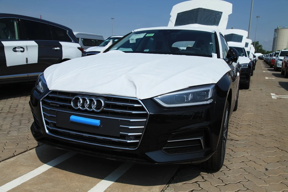Lô Audi A5 Sportback phiên bản sản xuất giới hạn 26 chiếc phục vụ APEC tại Việt Nam vừa về cảng ở TP.HCM. PHhên bản toàn bộ màu đen (màu trắng là keo dán chống trầy khi vận chuyển)