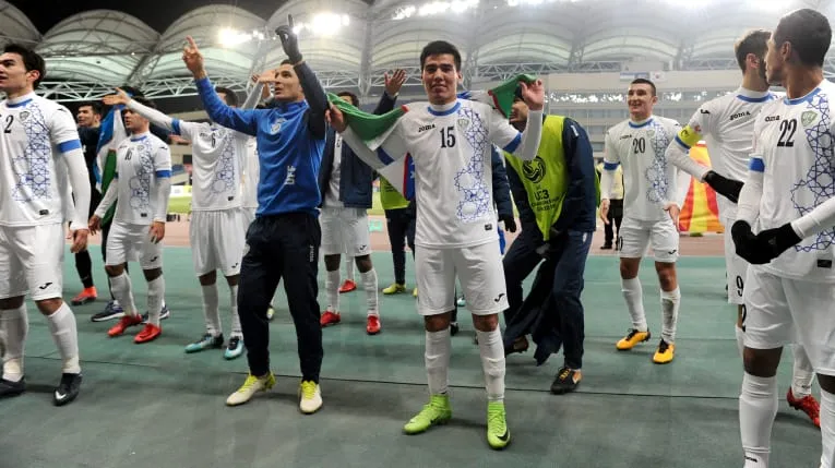 Các cầu thủ Uzbekistan chia vui cùng người hâm mộ quê nhà sau khi thắng Hàn Quốc.