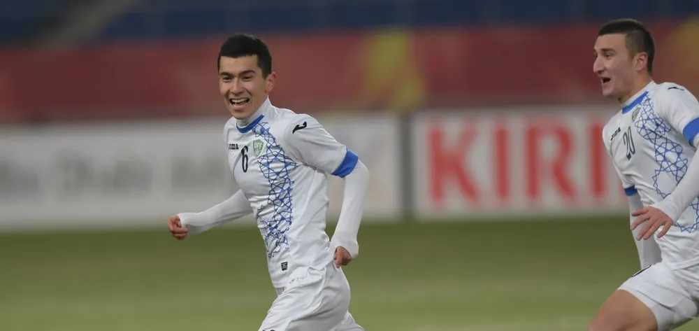 Ganiev (số 6) vui mừng sau khi ghi bàn thắng cho Uzbekistan.