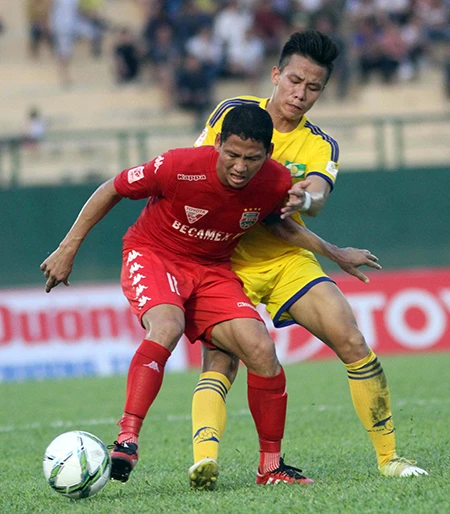 Quế Ngọc Hải (sau) trở lại thuyết phục và sốc tinh thần các cầu thủ SL Nghệ An lên tìm được chiến thắng đầu tiên trước nhà vô địch B. Bình Dương. Ảnh: XUÂN HUY