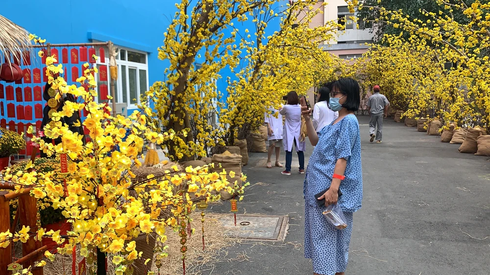 Nhập viện để lên lịch mổ khối u buồng trứng, chị Trần Thị Thiên Phương (ngụ tỉnh Đồng Nai) tranh thủ đi dạo, chụp hình với đường hoa. “Đi dạo đường hoa, tôi cảm thấy rất xúc động và cảm nhận không khí Tết đang ùa về, tôi không nghĩ trong BV lại có một không gian xuân như thế này” - chị chia sẻ.