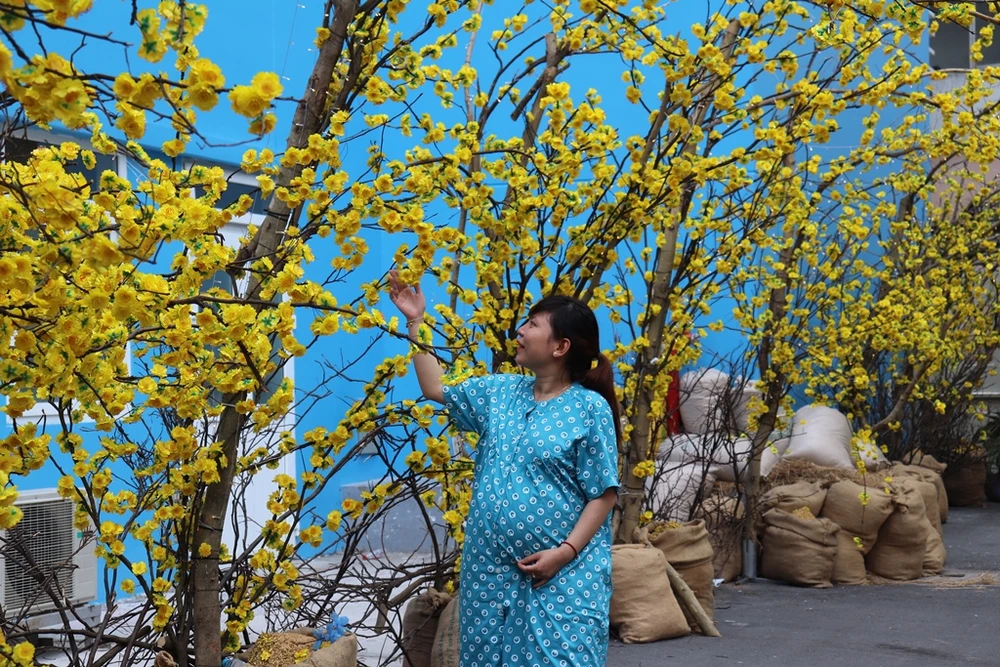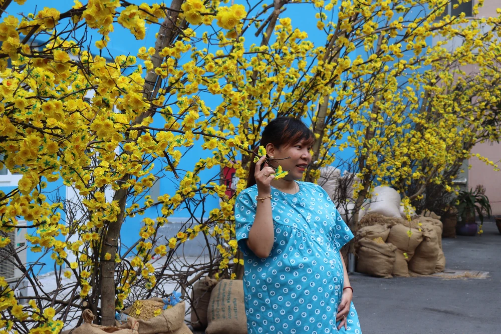 Tạo nhiều dáng với những khóm mai vàng rực rỡ, chị Phạm Ngọc Bích Trâm (ngụ quận 12) cho biết tranh thủ chụp nhiều hình để kỷ niệm. “Đây là bộ ảnh xuân đầu tiên của tôi. Đang mang thai mà nghe dịch COVID dữ quá nên tôi không dám đi ra chỗ đông người hay các trung tâm thương mại để chụp hình” - chị Trâm nói.