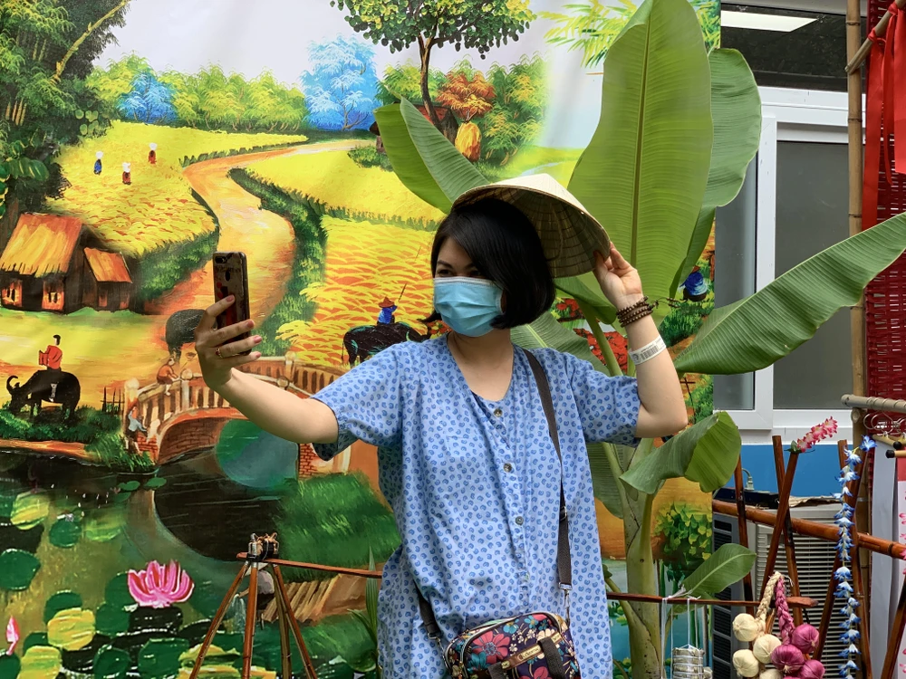 Chị Phạm Ngọc Bích Trâm tranh thủ chụp hình với đường hoa Bệnh viện Từ Dũ. Ảnh: HL