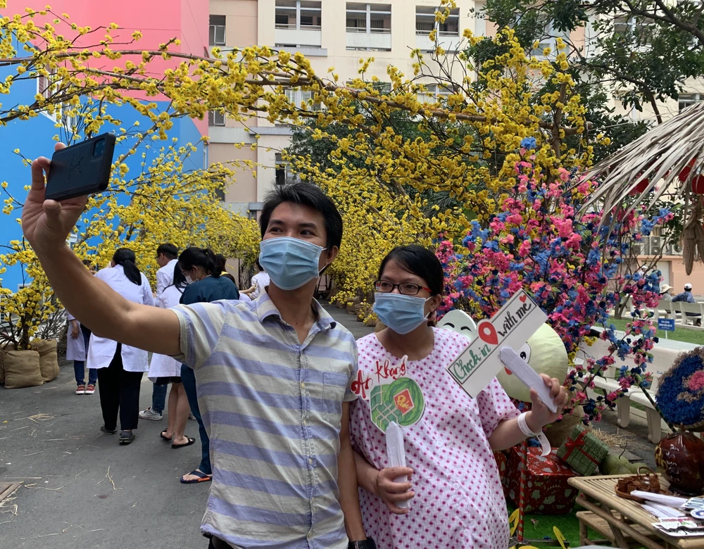 Cặp vợ chồng lưu lại những khoảnh khắc ở đường hoa xuân Bệnh viện Từ Dũ. Ảnh: HL
