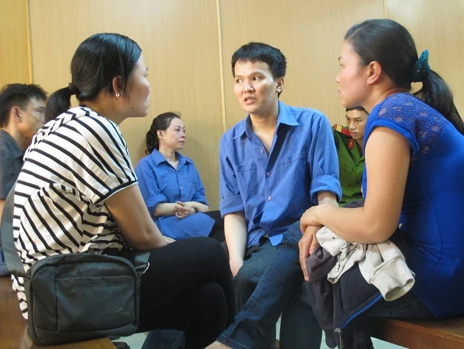 Bị cáo Phượng (ngồi góc trong) và Hào đang nói chuyện với người thân khi toà nghị án