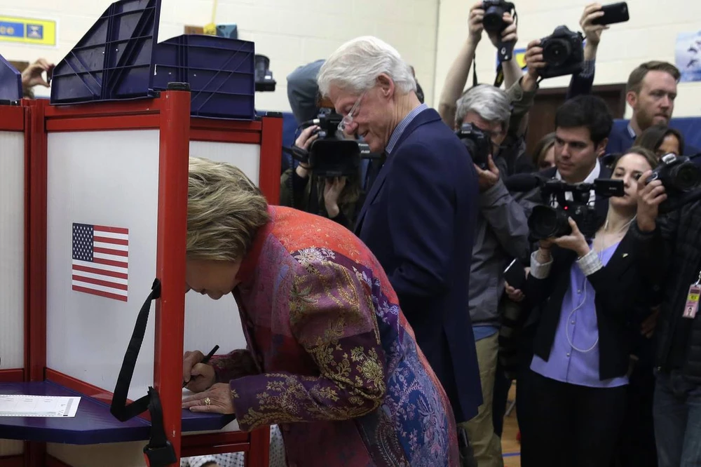 Bà Hillary Clinton và chồng là cựu Tổng thống Bill Clinton bỏ phiếu tại bang nhà New York ngày 19-4. Ảnh: AP
