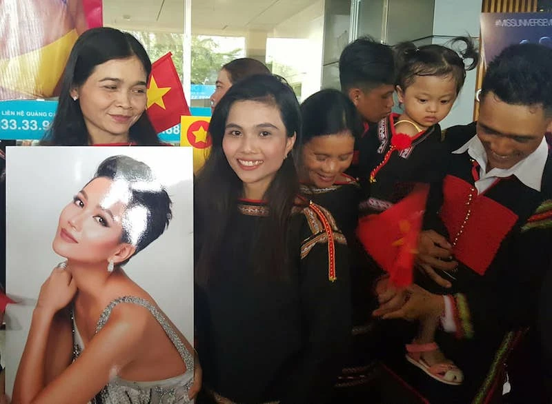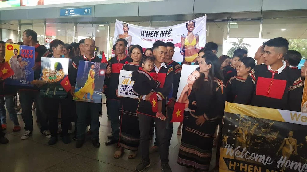 Chiều 18-12, hoa hậu H'Hen Niê về sân bay Tân Sơn Nhất (TP.HCM) sau hành trình tham gia Hoa hậu hoàn vũ (Miss Universe). Rất đông fan hâm mộ đã chờ đón H'Hen, cô hoa hậu vừa lập thành tích vào Top 5 Miss Universe. Em rể H'Hen Niê cho biết cả nhà thuê xe đi từ tối 17-12, mọi người vui đến mất ngủ. Chưa bao giờ buôn làng rộn vui như thế.