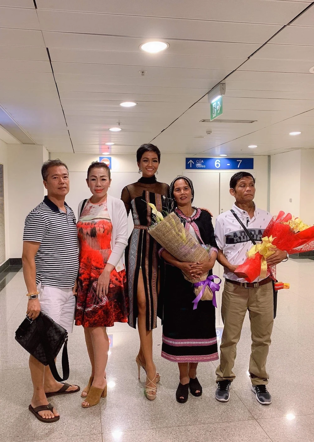 H'Hen Niê khi vừa xuống sân bay Tân Sơn Nhất cùng ba mẹ và gia đình nhà thiết kế Linh San