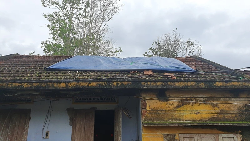 Nhà bà Toan bị cây đè sập một phần mái ngói, phải dùng bạt để che lại.