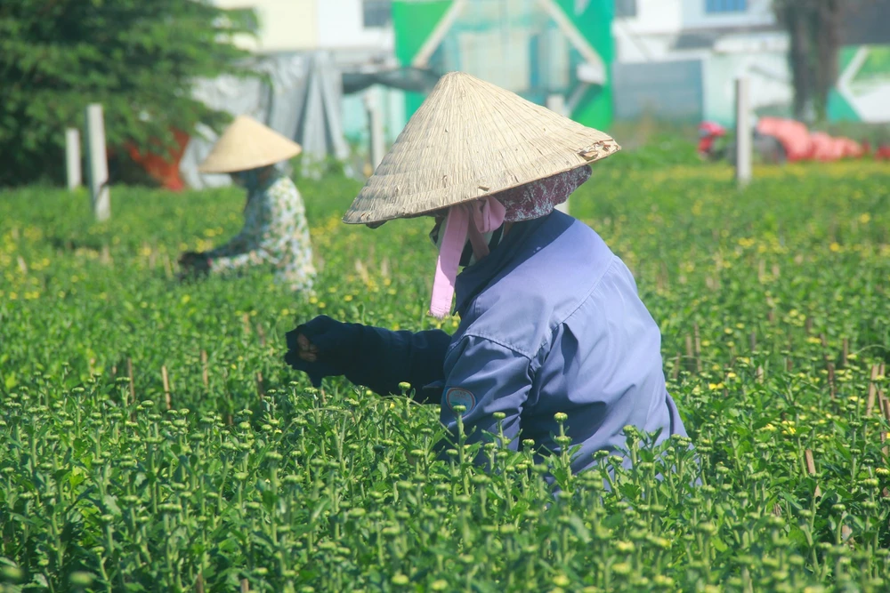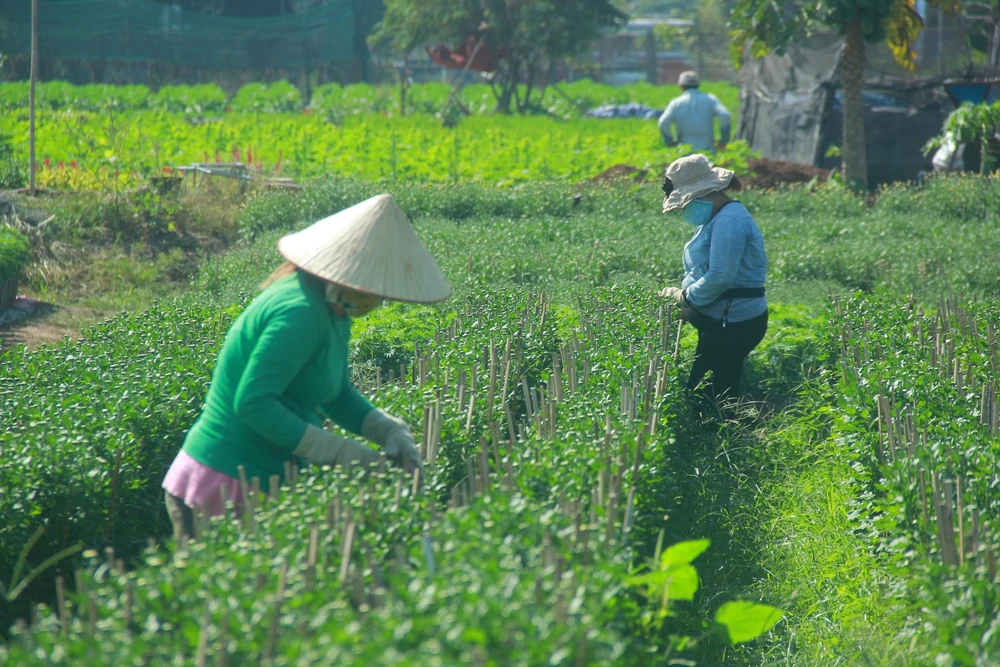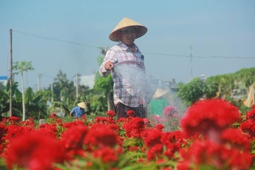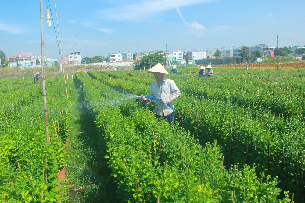 Bà con tại vườn hoa ở phường Thới An, quận 12 đang gấp rút tưới tiêu, chăm hoa. Ảnh: TÂM - HÀ