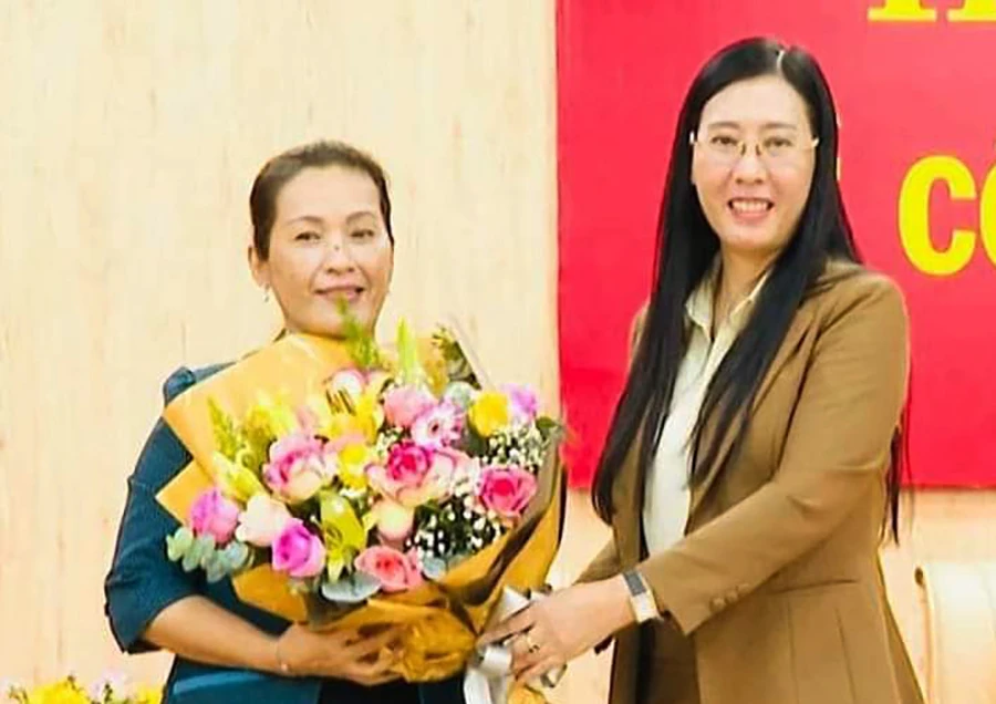 Bà Bùi Thị Quỳnh Vân, Bí thư Tỉnh ủy tặng hoa chúc mừng bà Đinh Thị Hồng Minh (Trái) được bầu giữ chức Phó Bí thư tỉnh ủy Quảng Ngãi