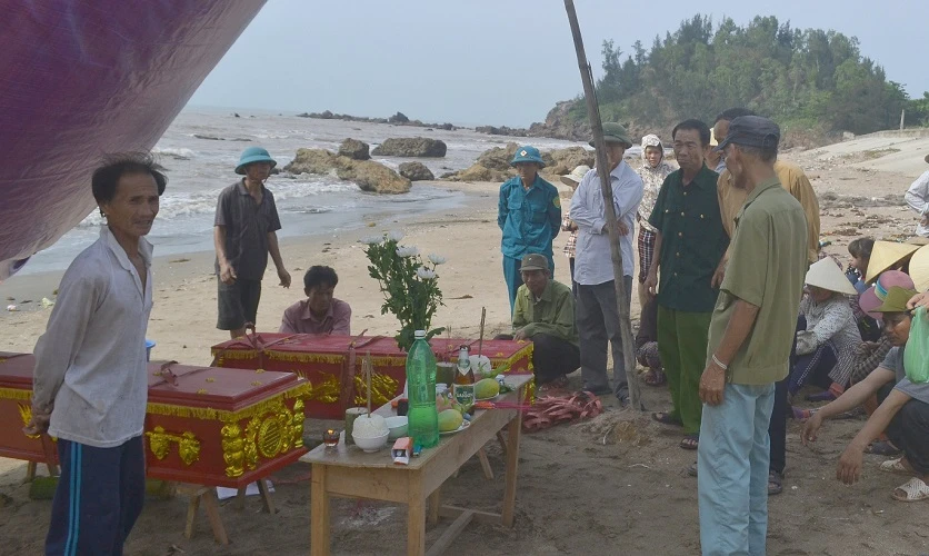 Chiều 16-5, ở huyện Quỳnh Lưu (Nghệ An) cũng đã xảy ra vụ đuối nước thương tâm làm hai anh em sinh đôiVũ Văn Huynh, Vũ Văn Đệ (cùng 11 tuổi) và em Bùi Quang Thành chết trên vùng biển xã Quỳnh Long (huyện Quỳnh Lưu). Ảnh: H.Dương