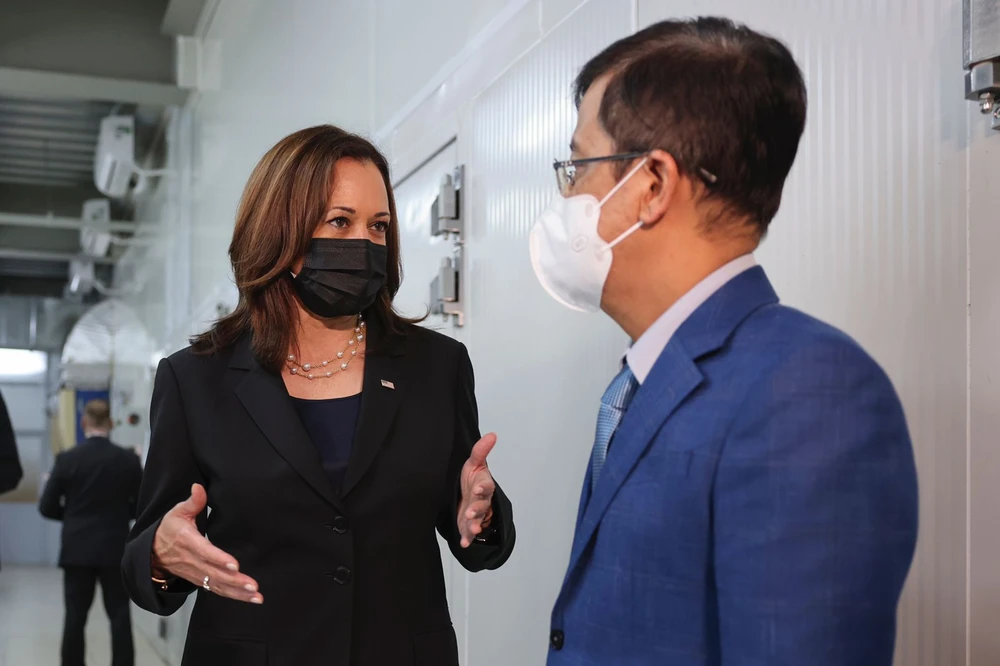 Phó Tổng thống Kamala Harris đến thăm Viện Vệ sinh Dịch tễ Trung ương Hà Nội và được Viện trưởng-Giáo sư Đặng Đức Anh đưa đi tham quan kho lạnh âm sâu nơi bảo quản vaccine của Pfizer/BioNTech. Ảnh: AP/ĐSQ MỸ