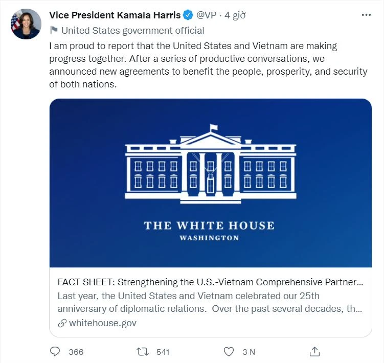 Cùng dòng trạng thái này, bà Harris đính kèm trang thông tin đã được đăng trên trang web Nhà Trắng có tựa đề: Củng cố quan hệ đối tác toàn diện Mỹ-Việt.
