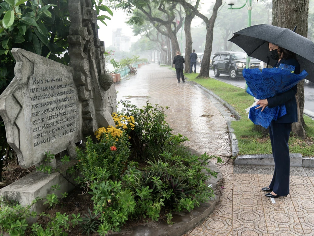 Hai tiếng trước đó, bà Harris đăng lên trang Twitter bức ảnh bà đến đặt hoa tưởng niệm tại đài tưởng niệm cố thượng nghị sĩ John McCain bên hồ Trúc Bạch ở Hà Nội.