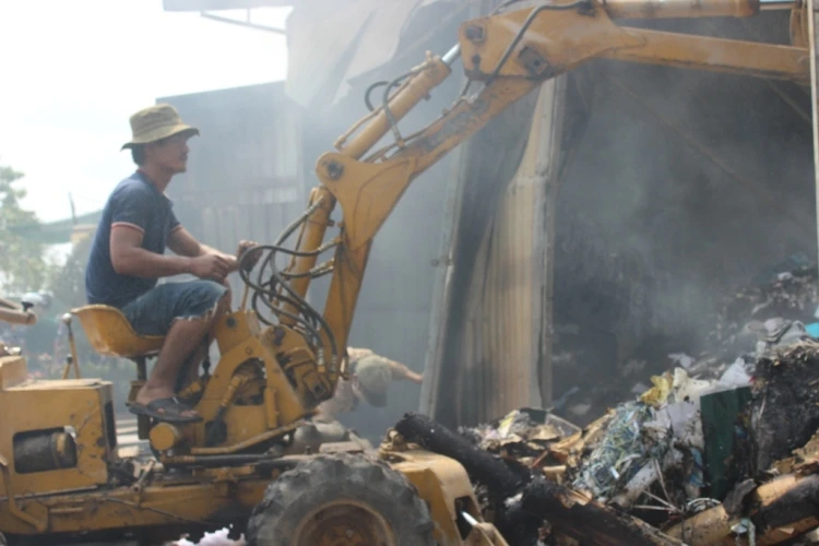 Hiện trường vụ cháy, xe múc được điều động đến hiện trường