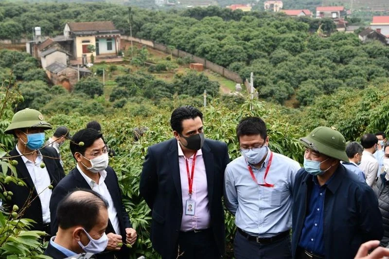 Bộ trưởng Nguyễn Xuân Cường (ngoài cùng, bên phải) kiểm tra tình hình sản xuất quả vải tại Bắc Giang. Ảnh: VĂN GIANG