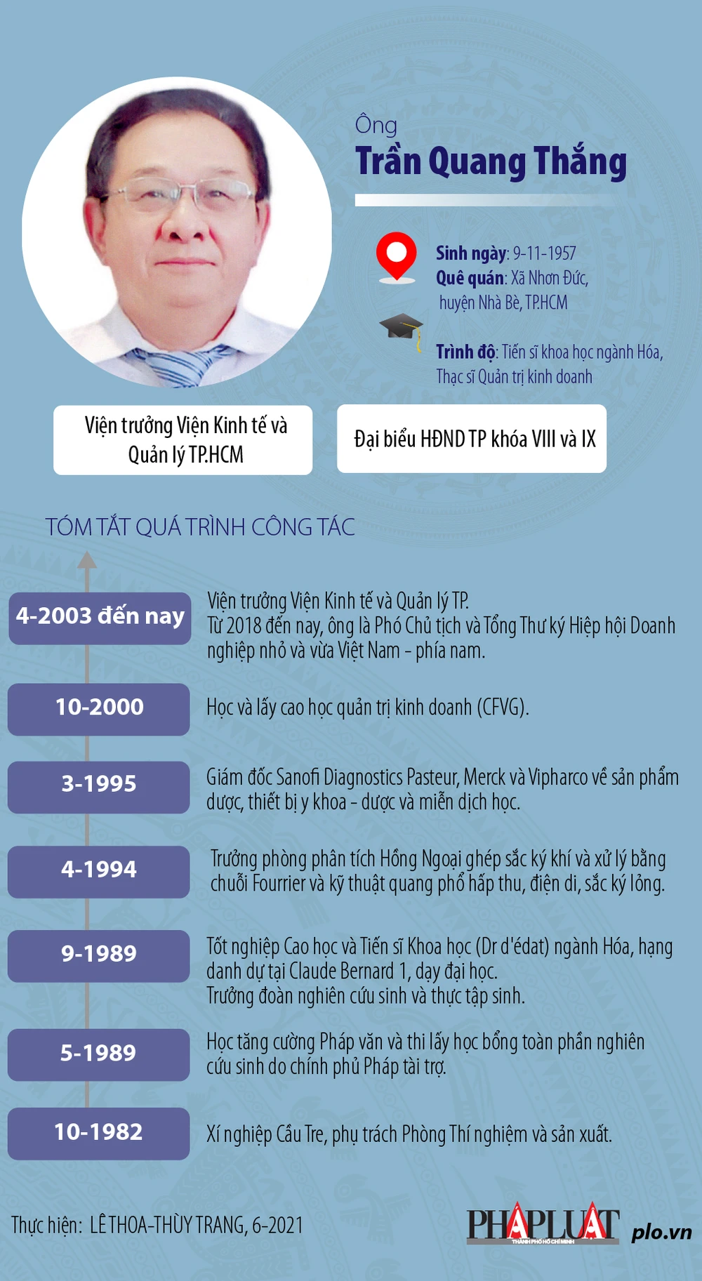 | Tiếp tục góp ý để nâng cao chất lượng chất vấn, giám sát Ông Trần Quang Thắng sinh năm 1957, quê ở huyện Nhà Bè, TP.HCM. Ông có trình độ tiến sĩ khoa học ngành hóa, thạc sĩ quản trị kinh doanh. Từ năm 2003 đến nay, ông giữ chức viện trưởng Viện Kinh tế và Quản lý TP.HCM. Từ năm 2018 đến nay, ông là phó chủ tịch và tổng thư ký Hiệp hội Doanh nghiệp nhỏ và vừa Việt Nam phía Nam. Trong chương trình hành động của mình, ông Trần Quang Thắng cam kết tiếp tục góp ý đổi mới, cải cách, nâng cao chất lượng hoạt động của các doanh nghiệp phía Nam; nâng cao chất lượng của hoạt động chất vấn, công tác giám sát, nội dung các đợt tiếp xúc cử tri, đôn đốc giải quyết kiến nghị, nguyện vọng của cử tri và nhân dân. Ông cũng cam kết sẽ góp ý tích cực và kiến nghị giải pháp cho vấn đề tắc nghẽn giao thông, chuyển đổi số; cải thiện cơ sở hạ tầng, phát triển trường học, bệnh viện và trùng tu, nâng cấp các thiết chế văn hóa, di tích TP.HCM; chuyển đổi công nghệ xử lý rác của các nhà máy; giảm ngập lụt, phát triển nông nghiệp công nghệ cao và bền vững, an toàn vệ sinh thực phẩm, thích nghi và giảm thiểu tác động biến đổi khí hậu… |