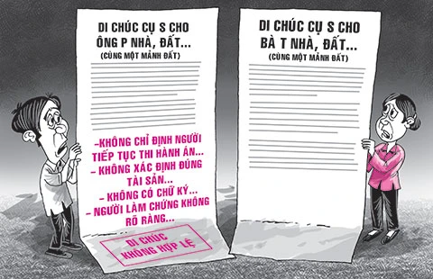 Theo tòa, đến ngày 30-11-2007, cụ Sa tiếp tục lập di chúc cho ông Phước, có dấu lăn tay của cụ và ba người làm chứng nhưng không chứng thực. Vào thời điểm lập di chúc thì cụ Sa là người có nghĩa vụ phải thi hành theo bản án dân sự đã có hiệu lực nên diện tích đất chỉ còn 206,2 m2 nhưng di chúc lại ghi ngang 8 m, dài 45 m là không đúng. Bà Pha ký tên làm chứng cũng không phù hợp. Như vậy, di chúc cụ Sa lập cho ông Phước không hợp pháp. Từ những căn cứ trên, tòa tuyên bác yêu cầu khởi kiện của ông Phước.