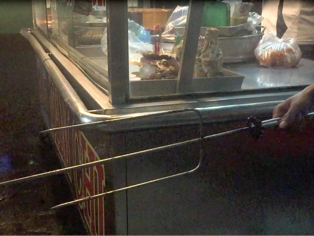 Thấy không có ai truy đuổi nên chủ tiệm bảo người này ra ngoài. Bất ngờ nam thanh niên rút cây ba chĩa (dụng cụ có ba thanh sắt sắc nhọn dùng để xiên thịt) đe dọa.