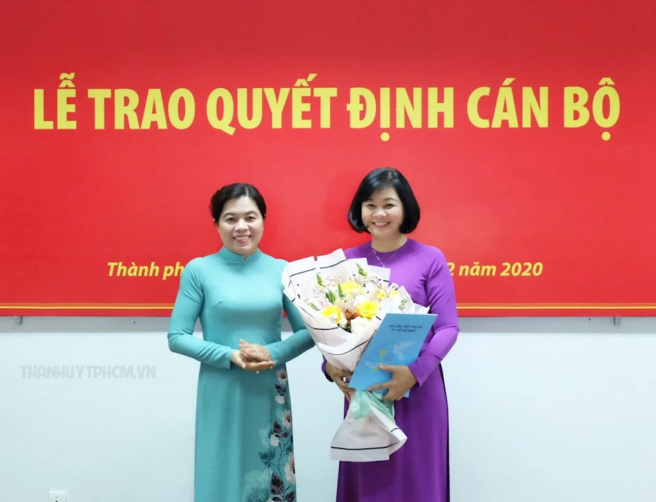 Chủ tịch Hội LHPN TP Nguyễn Trần Phượng Trân trao quyết định bổ nhiệm và tặng hoa chúc mừng bà Lý Việt Trung nhận nhiệm vụ mới. Ảnh: Web Thành ủy TP.HCM