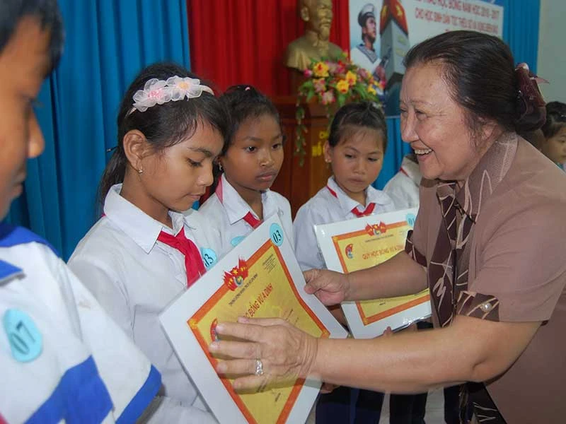 75 tuổi, bà vẫn miệt mài trong những chuyến trao học bổng cho học sinh khắp mọi miền đất nước. Trong ảnh: Má Ngọc trao học bổng của Quỹ Vừ A Dính cho học sinh tỉnh Phú Yên tháng 2-2017. Ảnh: THANH TRANG