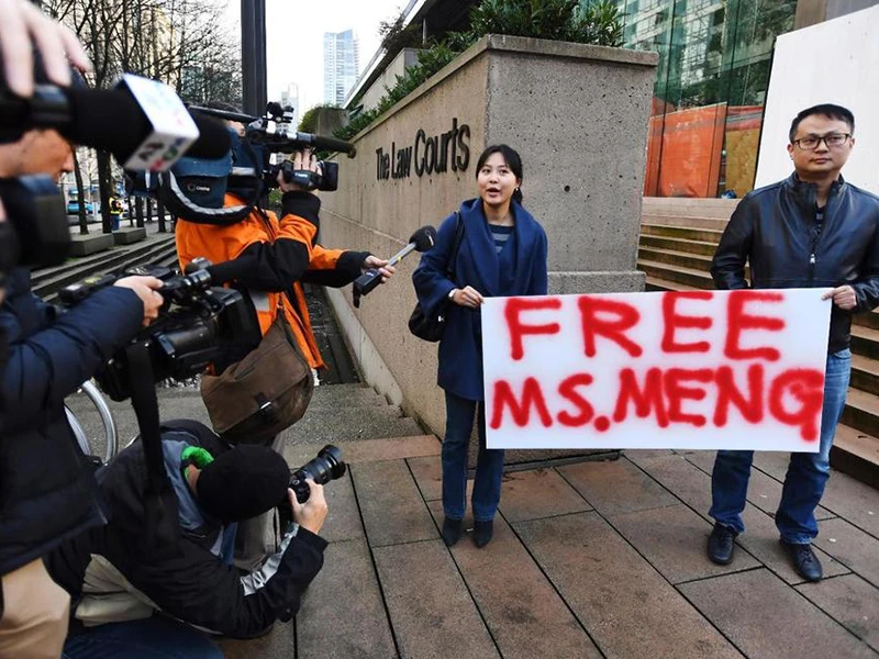 Người ủng hộ bà Mạnh biểu tình trước tòa án Vancouver (Canada) kêu gọi thả bà. Ảnh: CNN
