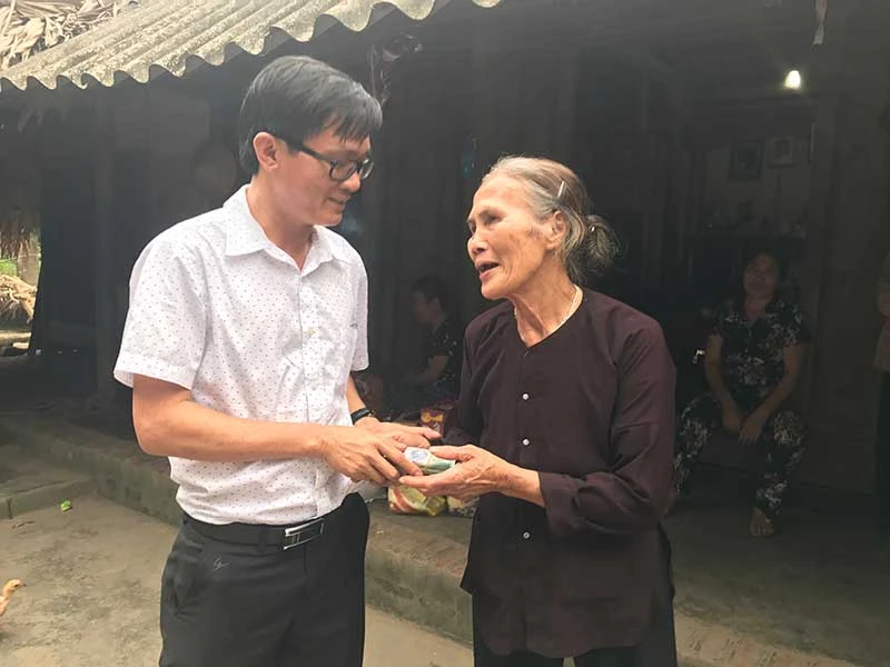 Tác giả đại diện một số nhà hảo tâm trao tiền giúp đỡ cụ Lực. Ảnh: SƠN LÂM