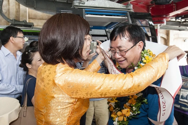 Bà Đỗ Thị Tuyết Hạnh, Giám đốc KDL Bà Nà Hills đón tiếp và tri ân du khách thứ 1 triệu ngay cổng cáp treo.