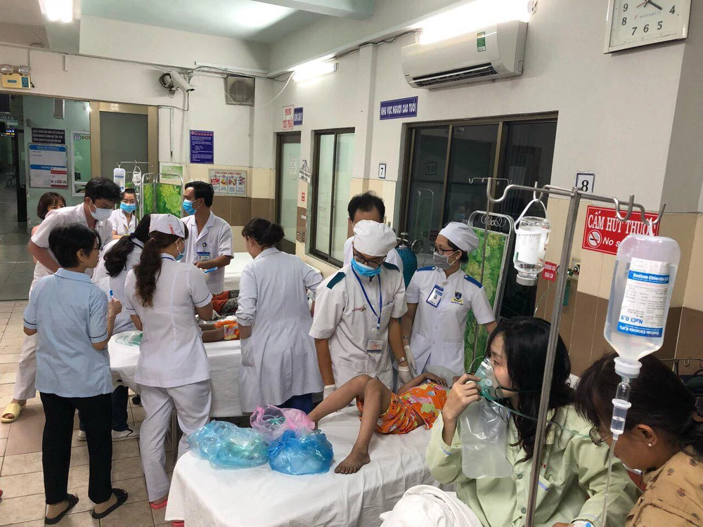 Hai cháu gái của bà Lệ (áo bông nền cam nằm trên giường) được bác sĩ chăm sóc lúc mới vào viện. Hiện hai em đã được ra viện. Ảnh: HOÀNG LAN