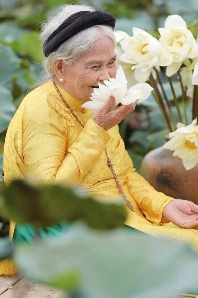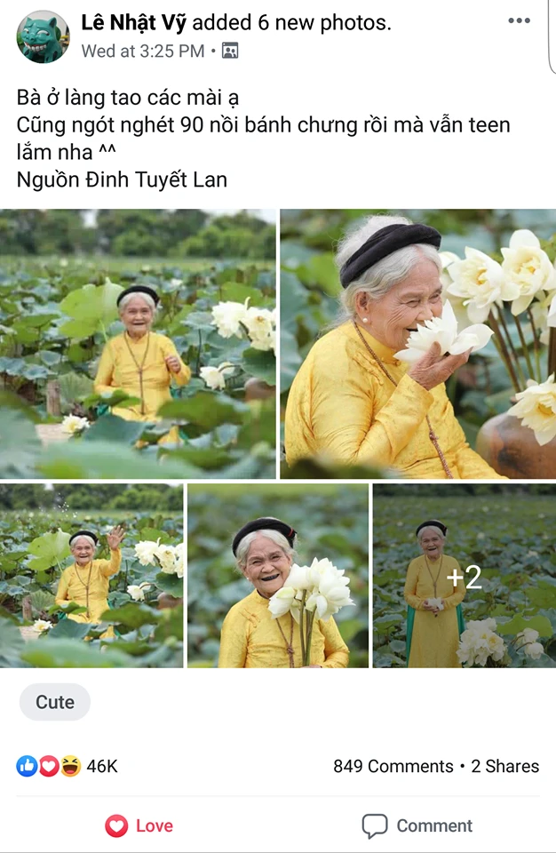 Một bạn trẻ đăng vào một group những bức ảnh của một cụ bà đẹp lão bên hồ sen đã gây bão mạng. Bạn viết: "Bà ở làng tao các mày ạ. Cũng ngót nghét 90 nồi bánh chưng rồi mà vẫn teen lắm nha".