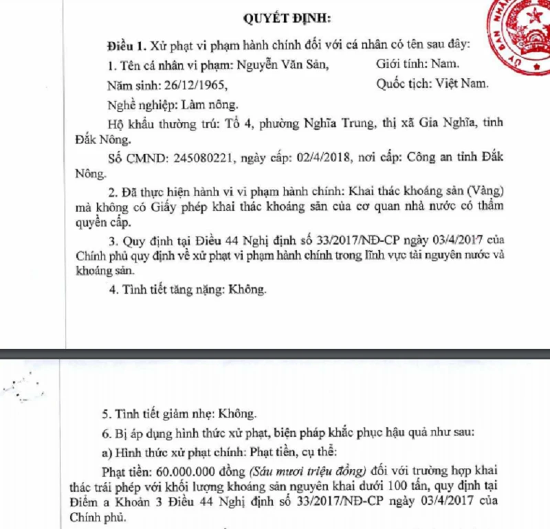 Theo đó, UBND tỉnh Đắk Nông đã ban hành quyết định xử phạt hành chính đối với ba người khai thác vàng trái phép nói trên với tổng số tiền 180 triệu đồng (mỗi người 60 triệu đồng). Hình thức phạt bổ sung là tịch thu toàn bộ tang vật khoáng sản hoặc toàn bộ giá trị bằng tiền của khối lượng khoáng sản đã tiêu thụ, tịch thu phương tiện sử dụng để vi phạm hành chính đối với hành vi vi phạm nêu trên. Đồng thời, buộc phải thực hiện các giải pháp cải tạo, phục hồi môi trường khu vực đã khai thác, đưa khu vực khai thác về trạng thái an toàn.
