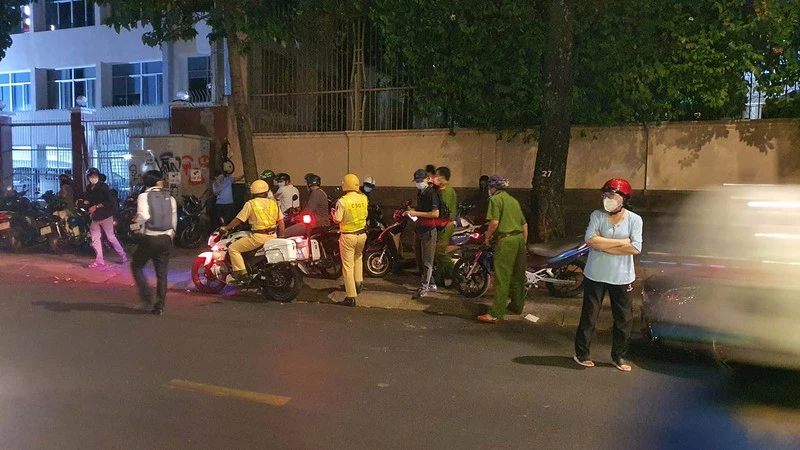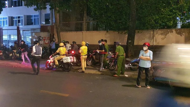 Lực lượng công an có mặt để đảm bảo an ninh trật tự trước khu vực nhà bà Hằng tại quận 3, TP.HCM vào tối ngày 24-3. Ảnh: PV