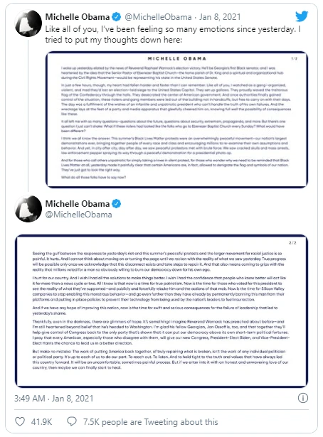 "Bây giờ là lúc các công ty ở Thung lũng Silicon ngừng tạo điều kiện cho hành vi quá mức này, tiến xa hơn những gì họ đã làm bằng cách cấm vĩnh viễn các tài khoản của người đàn ông này khỏi các nền tảng của họ, và đưa ra các chính sách để ngăn chặn công nghệ của họ bị các nhà lãnh đạo trên thế giới sử dụng để tiếp sức hành vi bạo loạn" - bà Obama viết.