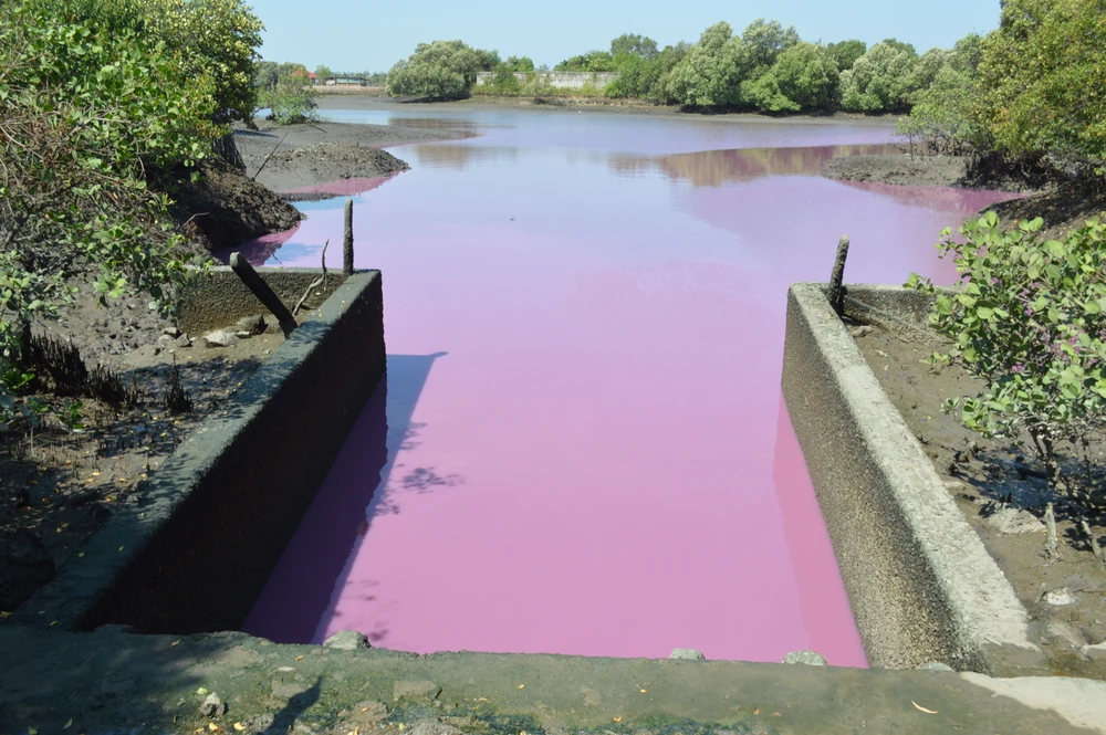 Cống số 6 (xã Tân Hải, huyện Tân Thành) bị ô nhiễm khiến xuất hiện các loại tảo làm nước chuyển màu, tới đây sẽ được đầu tư để cải tạo, khắc phục. Ảnh: TK