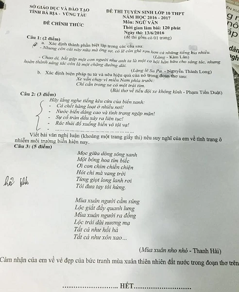 Cụ thể, ở câu 2 đề thi văn chính thức (3 điểm), đề bài đặt ra cho học sinh viết một bài văn nghị luận, giới hạn khoảng một trang giấy thi nêu suy nghĩ về tình trạng ô nhiễm môi trường biển hiện nay. Tình trạng ô nhiễm môi trường biển được biểu hiện qua những hiện tượng rác thải đổ xuống biển, cá chết hàng loạt ở nhiều nơi, sự cố tràn dầu, nước biển dâng và tình trạng ngập mặn.