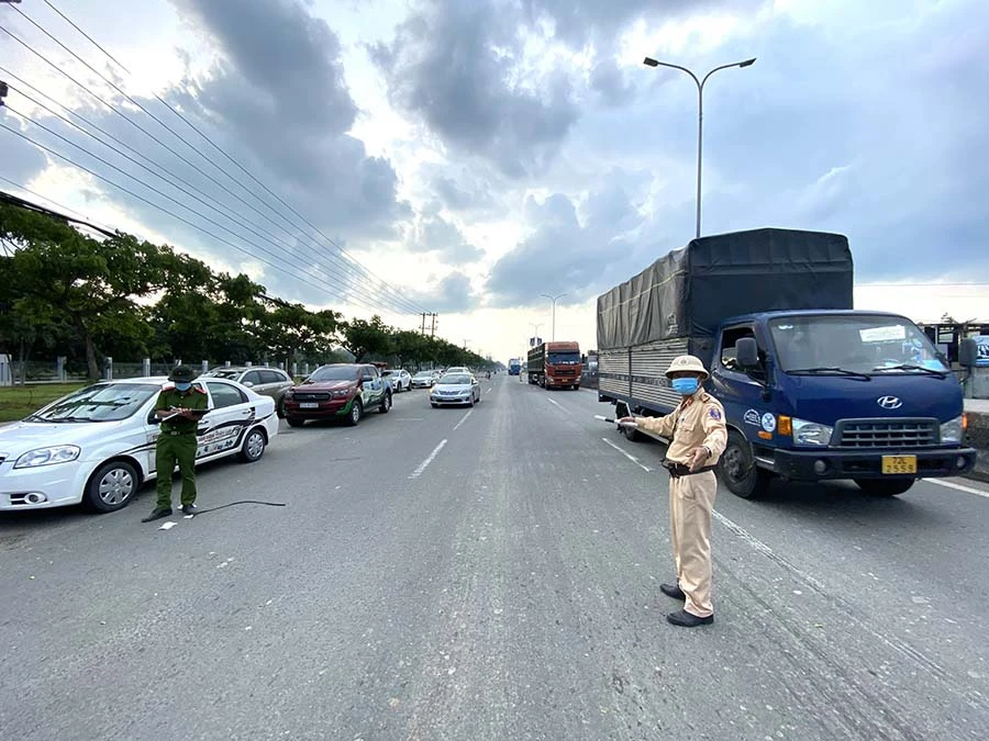 Hướng dẫn xe lưu thông vào chốt kiểm soát trên quốc lộ 51 hướng về Bà Rịa- Vũng Tàu. Ảnh: ML