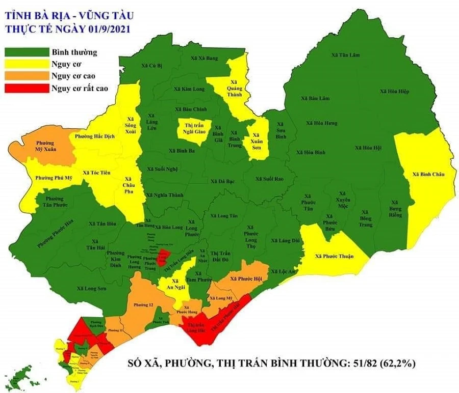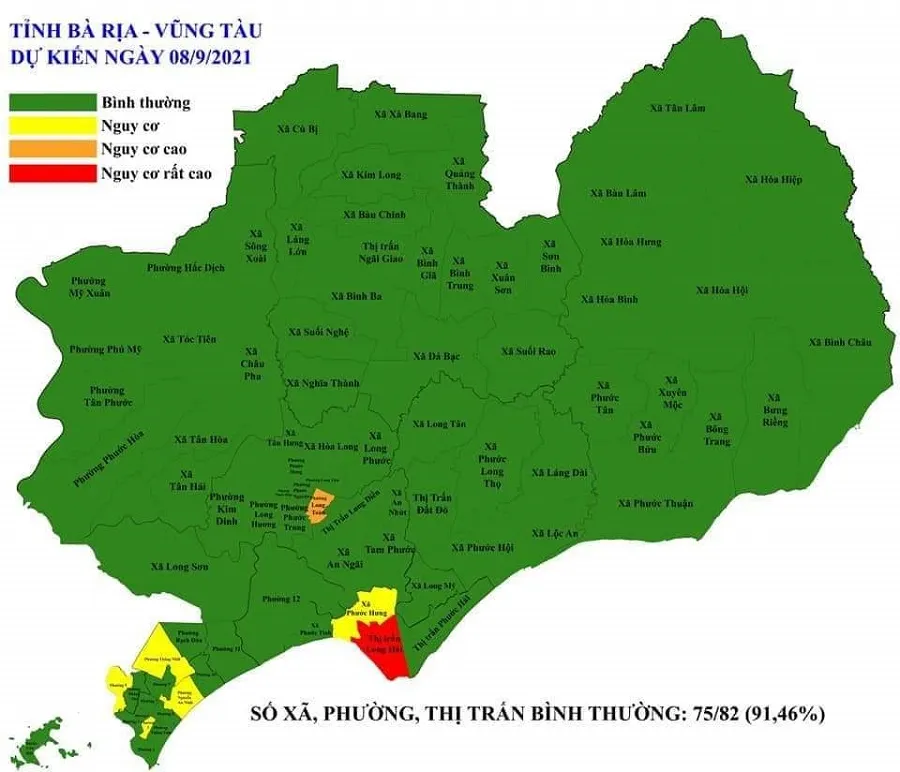 BCĐ dự kiến đến 8-9 theo bản đồ dịch tễ toàn tỉnh chỉ còn một vùng đỏ là thị trấn Long Hải (huyện Long Điền), một vùng cam ở phường Long Toàn (TP Bà Rịa) và 5 vùng vàng (xã Phước Hưng, huyện Long Điền; phường 3, 5 và phường Thắng Nhất, Nguyễn An Ninh của TP Vũng Tàu).