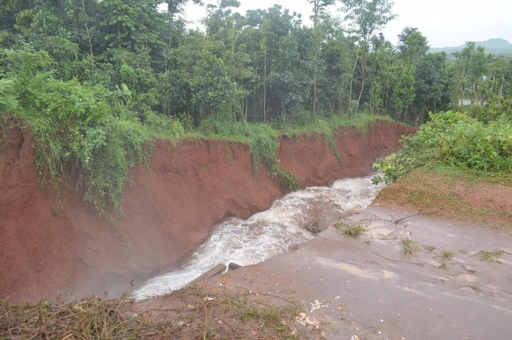 Do vỡ hồ khiến nước chảy mạnh, xói lở đất hai bên tràn xuống dưới nhà dân