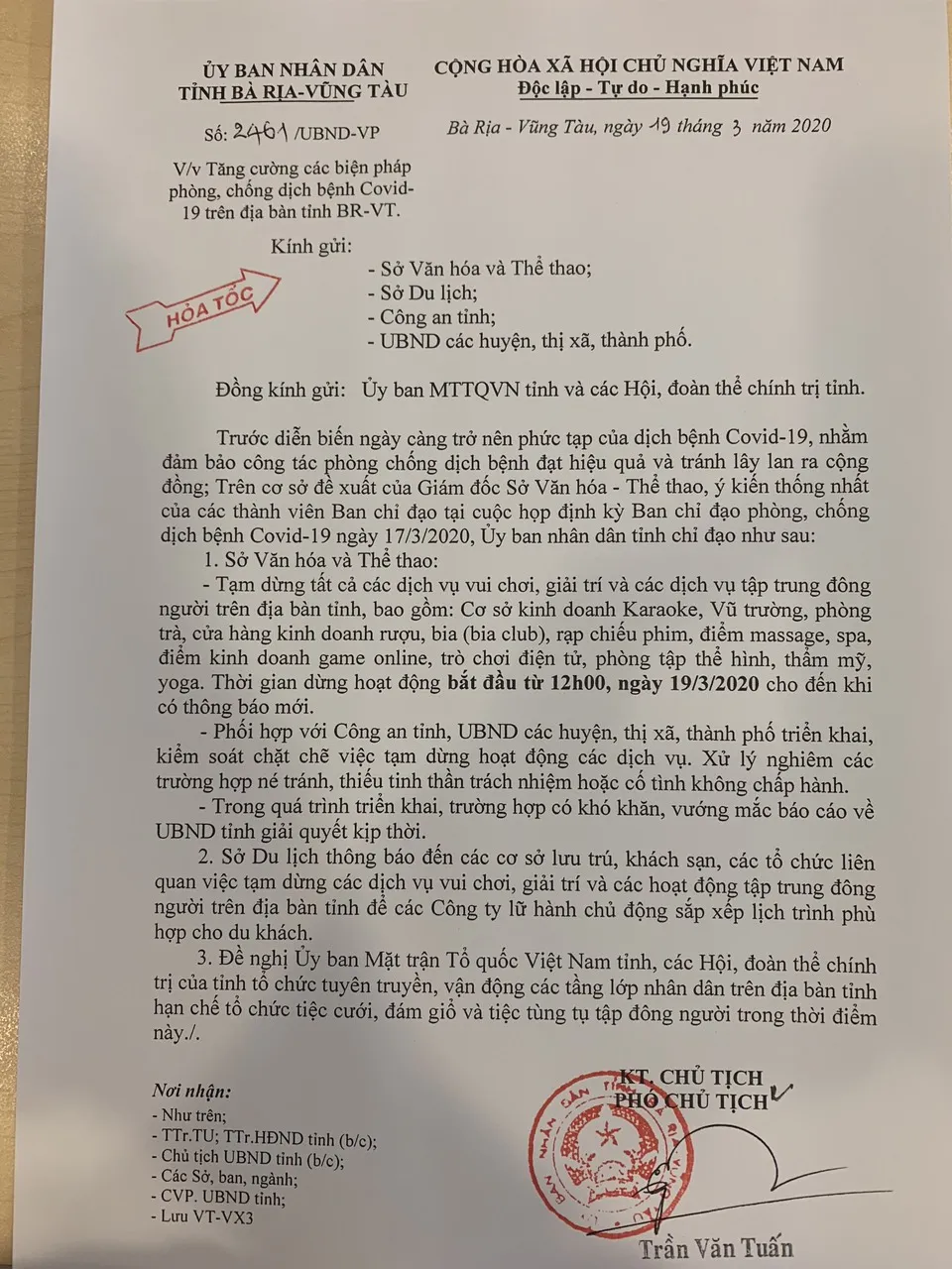 Công văn của UBND tỉnh Bà Rịa-Vũng Tàu sáng 19-3.
