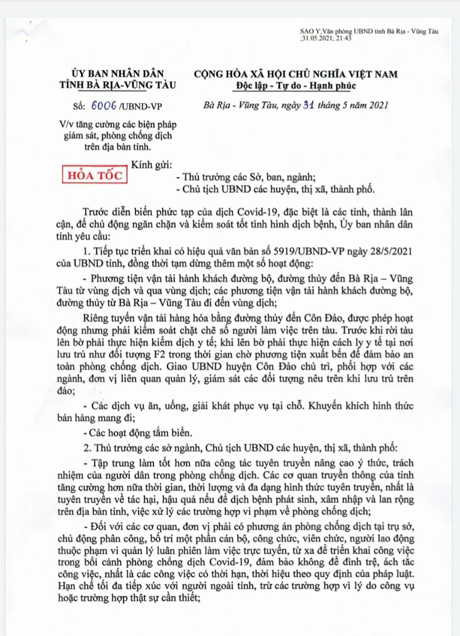 Công văn của UBND tỉnh Bà Rịa- Vũng Tàu tối 31-5
